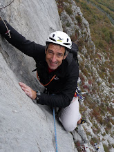 Fra le varie vie, siamo saliti su "Faccia da Pirla (6a)" e sul finire abbiamo fatto una via (senza nome) che partiva con un bel muro strapiombante alto circa 8 metri. Renzo qui mi ha fatto da coach facendomi capire a squarciagola che dovevo "tirare su i piedi". Ebbene, come li ho tirati su, voilà, sono uscito dal tratto finale di uesto difficile passaggio. Grazie Renzo.